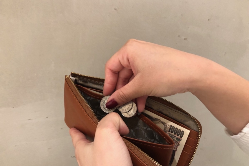 一度ファスナーを開けるだけでお札、小銭、カードの全てが取り出せるのでストレスフリーです。