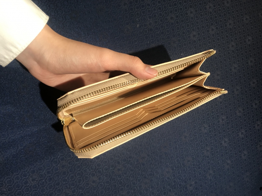 ファスナーを開くとお札、小銭、カードを一目で確認できます。