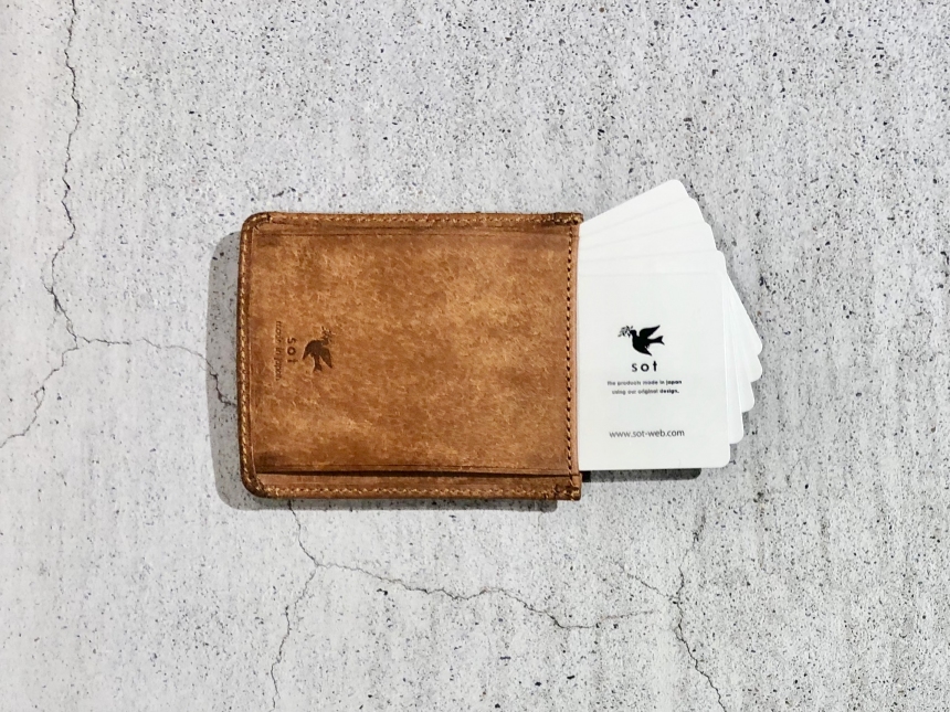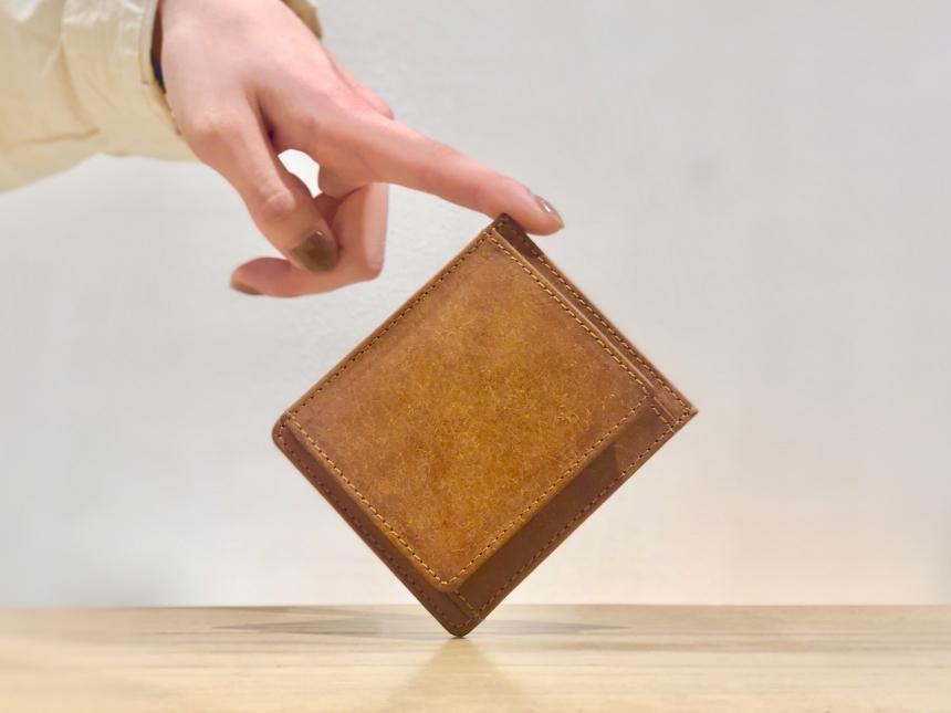このお財布の特徴は、何といってもそのサイズ感。縦9.5cm、横8.0cmの小ささに加えて、とっても薄い仕立てになっています。