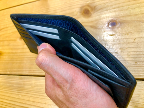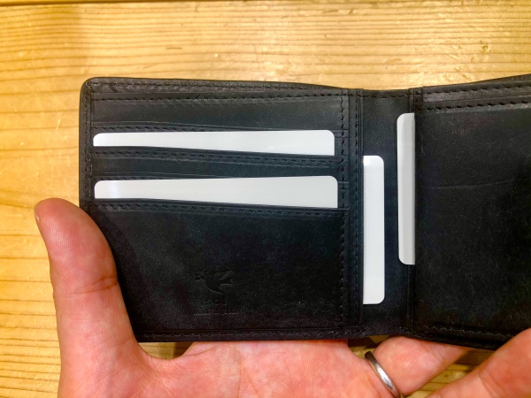個人的に好きな仕様が、お札入れの仕切にカードポケットが備わっており、もともと備わっている構造に、工夫をしてポケットを作っているので、余計な革を使用していない分、厚みが出づらい仕様になっています。