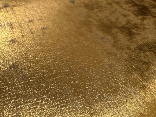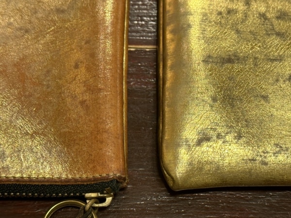 コーティングによってある程度革が守られるため多少の傷や水には強いですが、ダメージが蓄積してくると、貼り付けた箔が少しずつ剥がれていってしまいます。