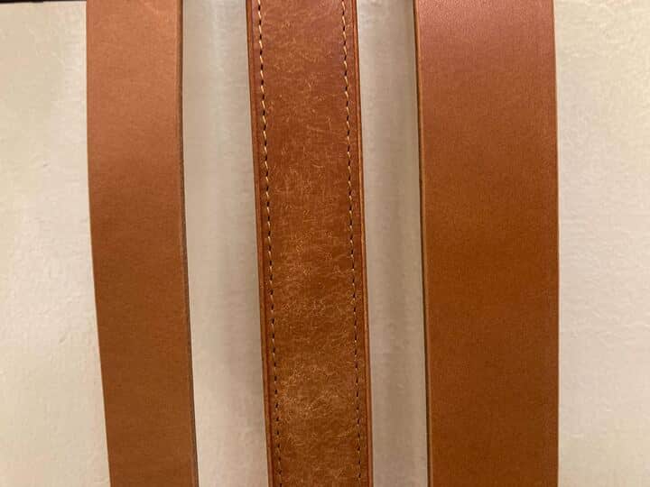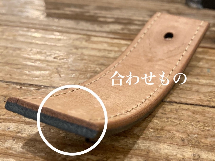 その一方で、画像のように二枚以上の革が合わさって作られているベルトを合わせものと呼びます。