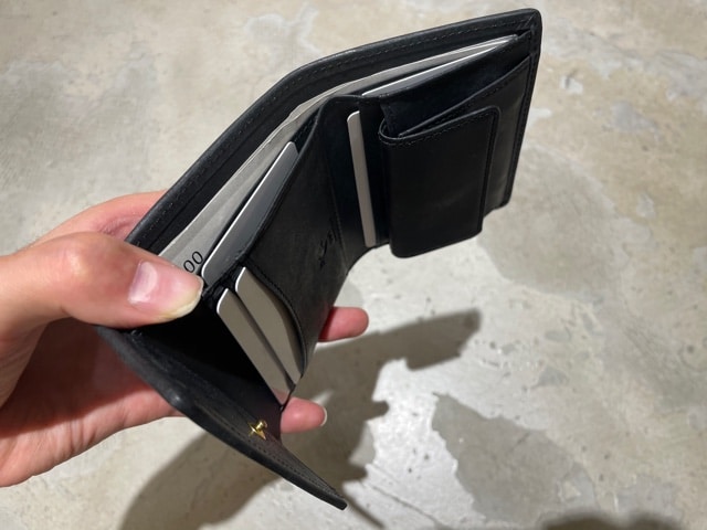 12枚小銭を入れて、カードポケットは手前に3枚、隠しポケットが2枚入る仕様で、全て入れた状態でもピッタリ丁度に納ます。