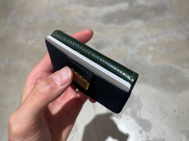 裏側のゴムバンドのところにカードが5枚入り取り出す際はベルトを引っ張ると出できます。