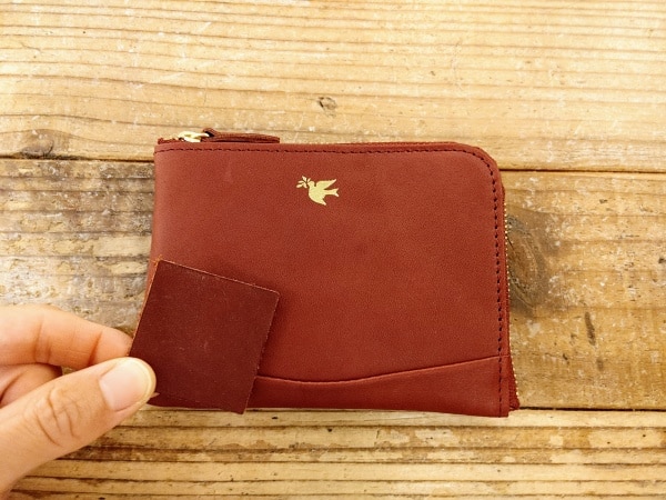 その経年変化後がこちら。経年変化後の見本が小さくて見づらいのですが、より光沢感が増し、深い色味に変わっています。