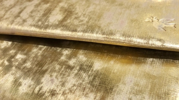 その表面を無造作にやすりがけすることで、落ち着いた輝きを放つ金色の革になります。