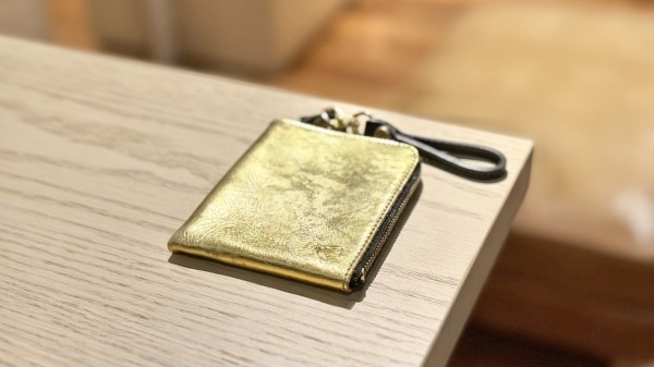 植物タンニンのみでじっくりとなめし、一切染色をしていないヌーディーなヌメ革を土台に、金色の箔を貼り付け。