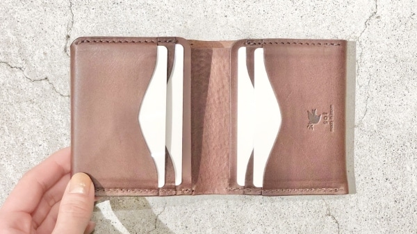 コンパクト財布の場合、ハリの強い革を使うと使い勝手悪くなりがち。