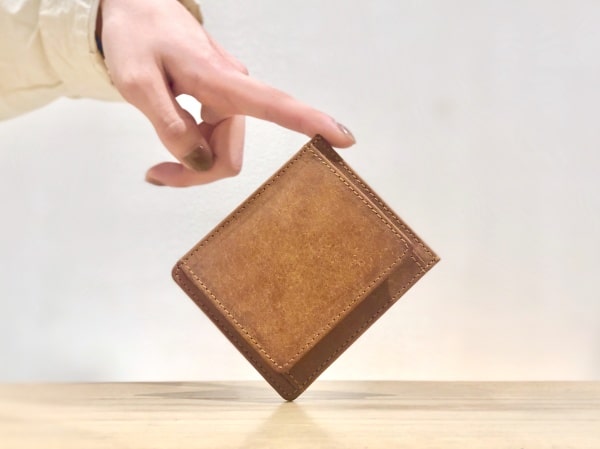 こうして、2つ折りにしたお札と小銭をとってもコンパクトに収納することができます。
