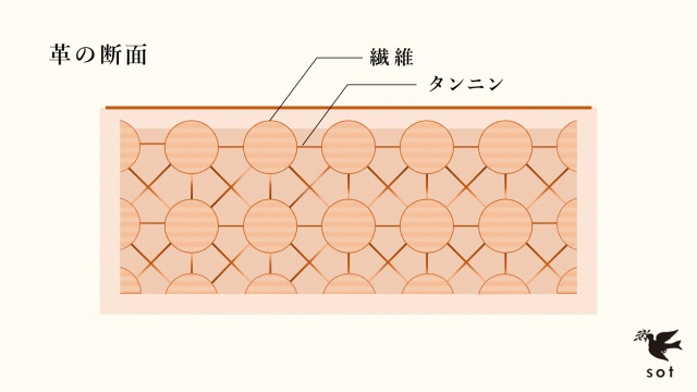 皮にタンニンを染み込ませる(皮を鞣す:なめす)ことで、皮の繊維とタンニンが反応して結合していきます。