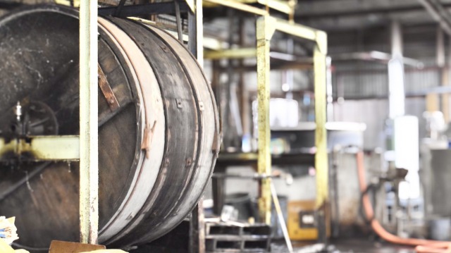 革を染める時には、バスケットゴール程の高さのある大きなドラムの中で、革を回転させながら染料を叩き込んでいきます。