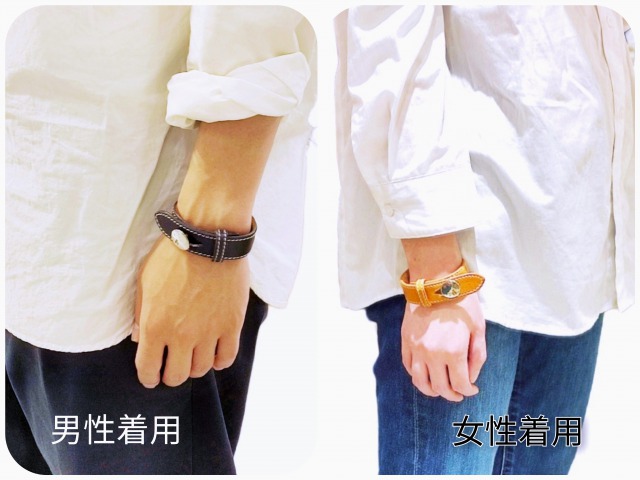 性別問わずつけられるレザーブレスレットは、カップルやご夫婦でペアアクセサリーとして身に着けるのも人気です。