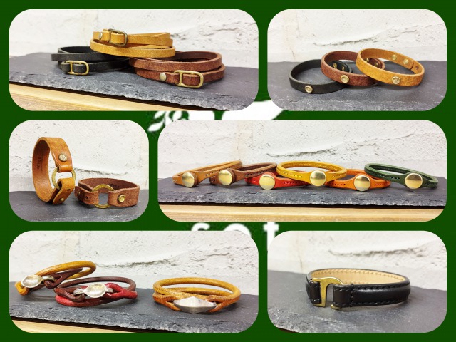 今回ご紹介したコンチョブレスレットのほかにも、当店には様々なレザーブレスレットがございます。