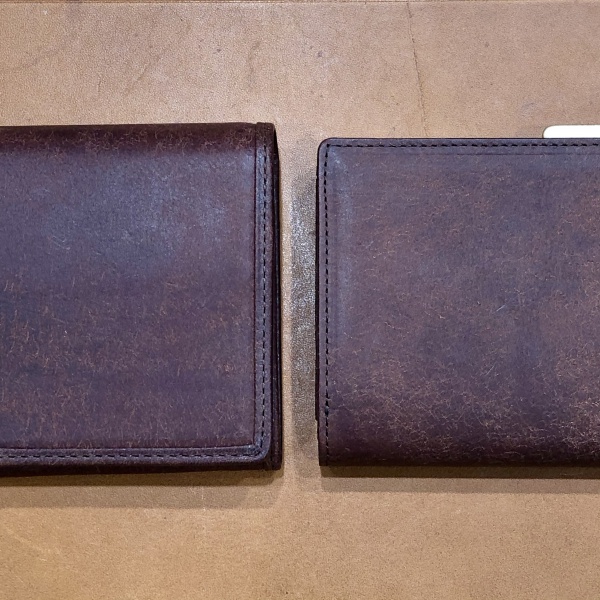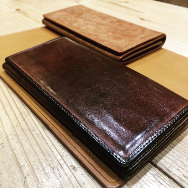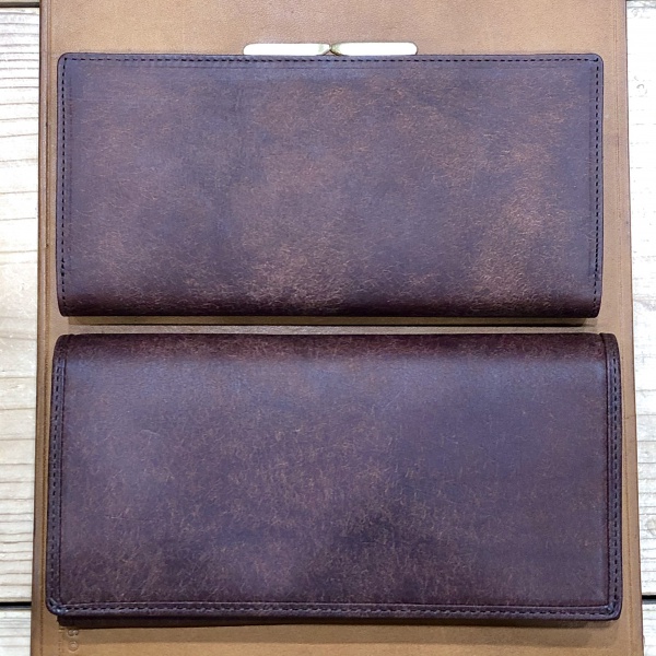 経年変化例として、お客様か使ってくださっていたお財布を以前撮らせていただきましたので、皆さま、あまりの違い、変化に驚いてください。笑
