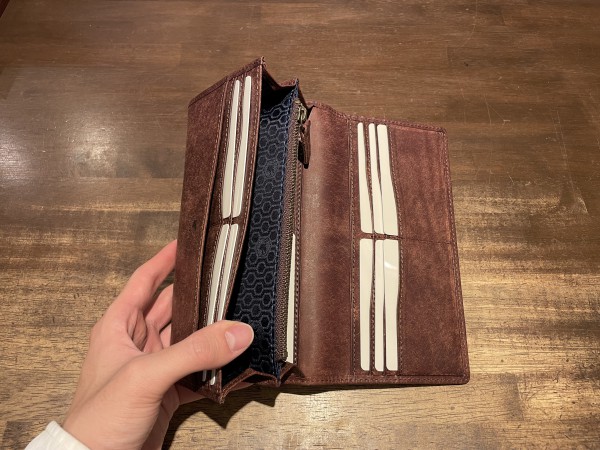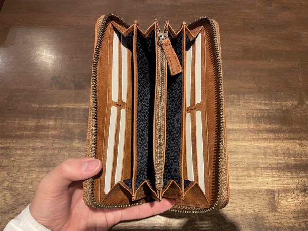 小銭入れにファスナーが付いていないつくりなので、外側のファスナー一回で小銭・お札・カードなどを取り出せるので非常に使いやすいお財布になっています。