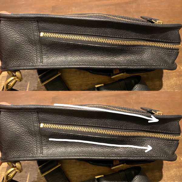 また、メインのファスナーも斜めに入っていることで開きやすく、荷物がこぼれ落ちにくくなっております。