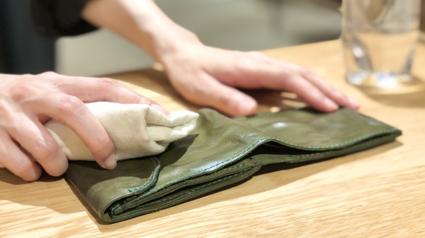 そのため、乾燥した革に油性クリームを使う際は、硬く絞った布などで全体を拭いて、汚れを落としながら「加湿」した後に、塗ってあげるとよいと思います。