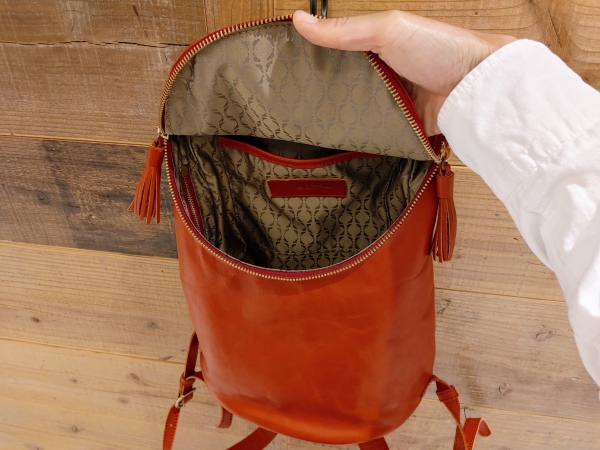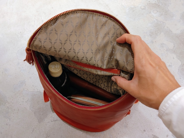 メインファスナーはラウンドタイプで口が大きく開くため、中が見やすく、出し入れしやすい作りに。