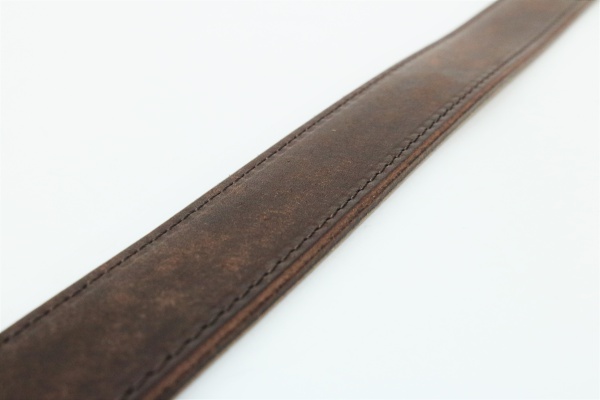 複数の革が重なった部分を布や薄い革でミシン掛けする加工の「へり巻き」