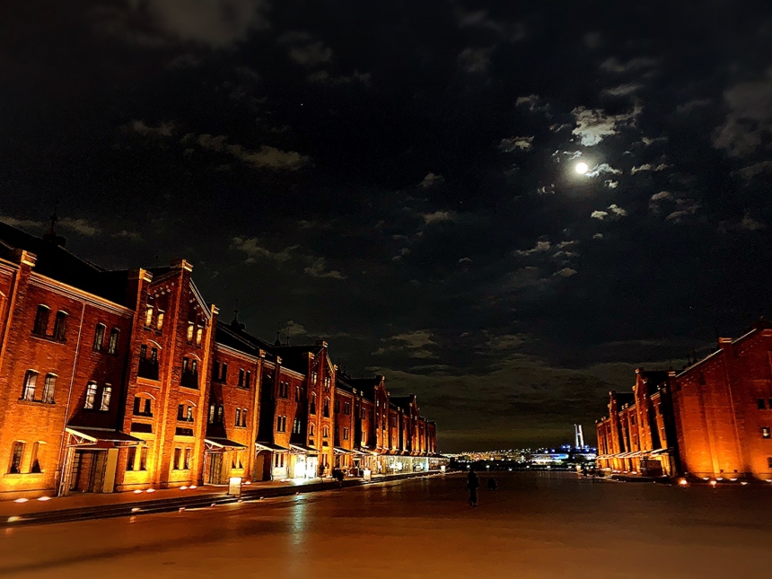 続いては、満月の日の横浜赤レンガ倉庫です。
