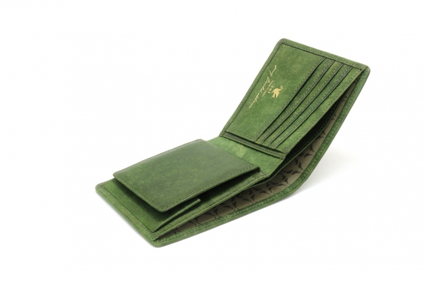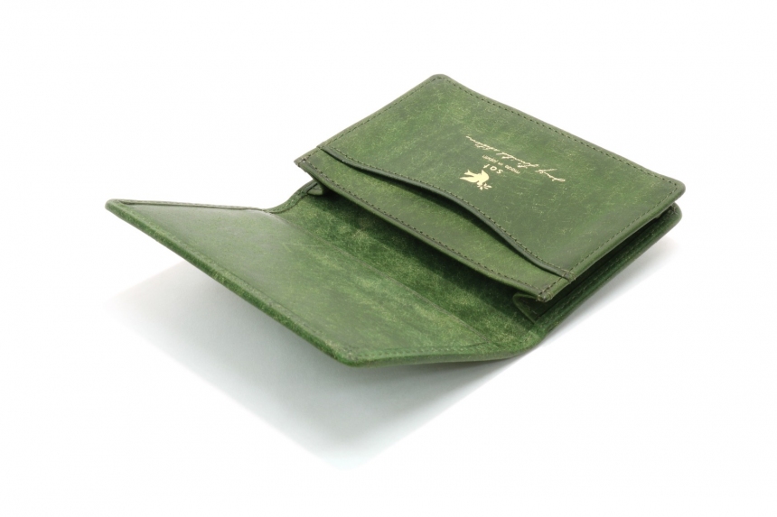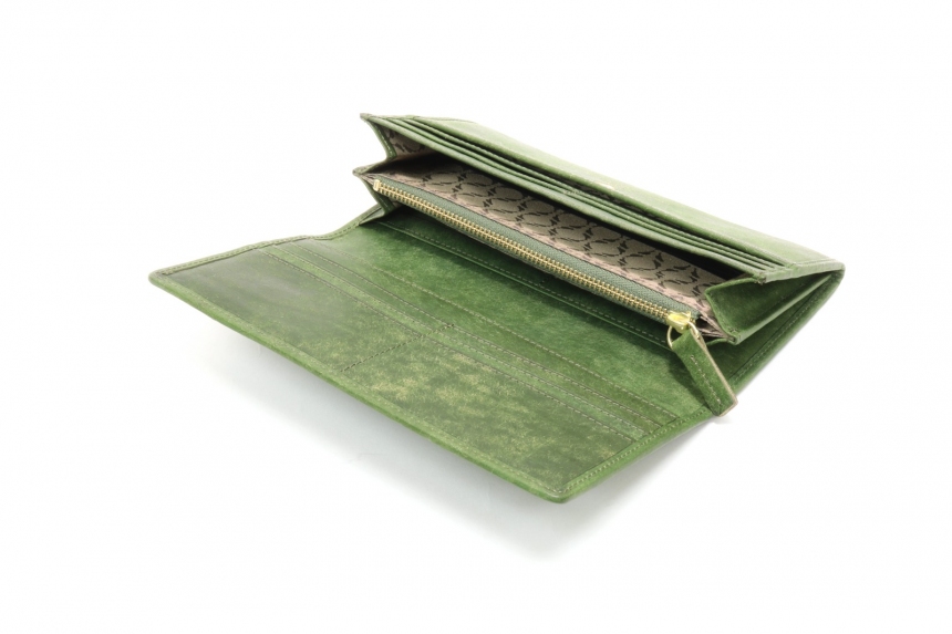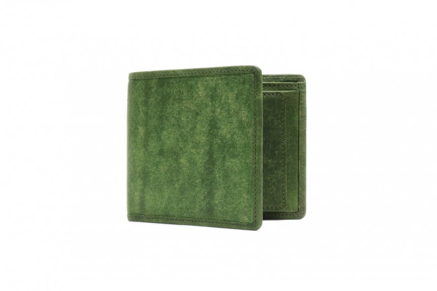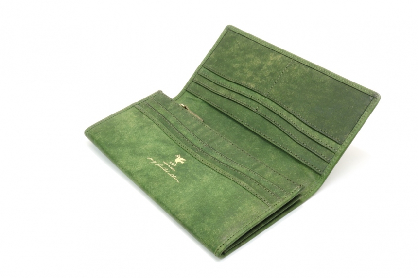 プエブロレザーの鮮やかな緑色をした新色を使用した限定品は、大切に使うことによって、日々渋みのある深い緑色に変化をしていきます。