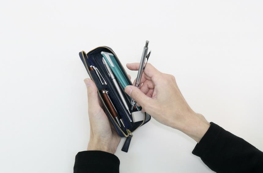 自分も仕事柄、ペンケースは馴染みのあるアイテムで、デスクに置いてある際の佇まいも安定感があり、スマートに仕上がっています。