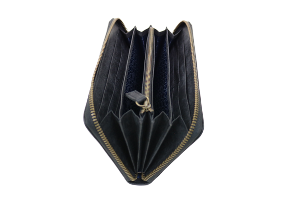 お札を折らないで収納できる長方形の形をした、ファスナー付きの長財布。